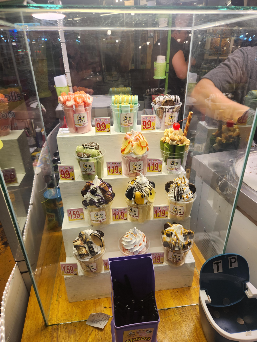 꼬치랑 맥주를 먹고 후식으로 철판 아이스크림을 먹었다. 둘째 날은 이렇게 숙소에서 수영과 시장에서의 저녁으로 마무리를 지었다.