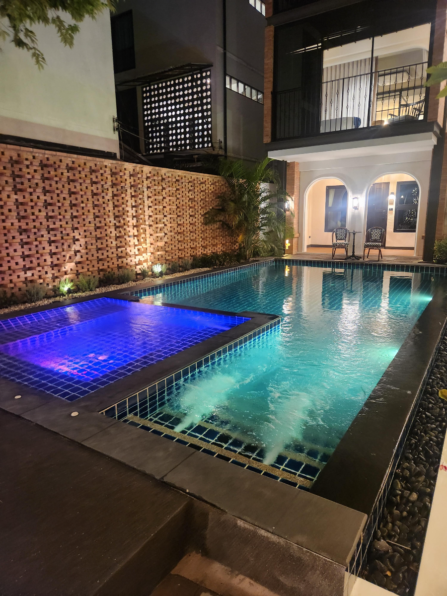 저녁에 조명이 들어온 수영장인데 꽤나 이쁘다.